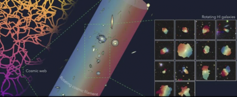 [출처: 필라멘트 내부 은하들(가운데)이 거대 우주 거미줄(왼쪽)을 따라 회전 - Lyla Jung / 동아사이언스]